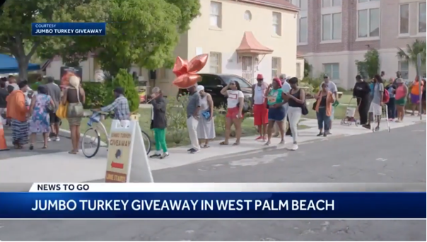 November, 2023: The Thanksgiving Jumbo Turkey Giveaway was featured on local news by NBC affiliate WPTV Channel 5. Palm Beach County Mayor Gregg Weiss and West Palm Beach Deputy Chief of Police Rick Morris were both in attendance to help hand out turkeys. The event was covered by WPTV Click here to watch WPTV coverage and Click here to see event video