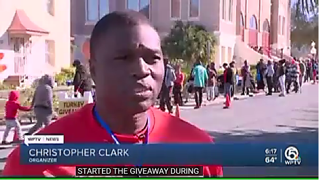 November 2023: NBC WPTV Channel 5 News coverage from the Jumbo Turkey Giveaway at Tabernacle Missionary Baptist Church, led by Event Organizer Christopher Clarke. Stated Clarke; “As a member of the community who was once in a position of need, I know first-hand how important it is to help others.” Mayor Gregg Weiss and Deputy Chief of Police Rick Morris were among the special guests assisting in the handout of 500 holiday turkeys. Watch Clarke speak to WPTV News