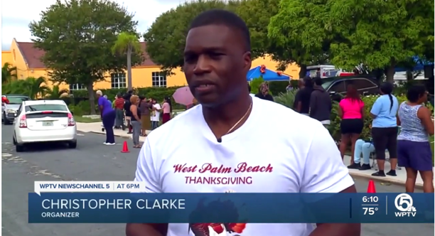 November 2022: CBS12 News reported Clarke’s organization of a turkey drive, distributing over 1,000 turkeys together with The Fund, West Palm Beach Police, and local organizations. Watch Clarke be interviewed on CBS News